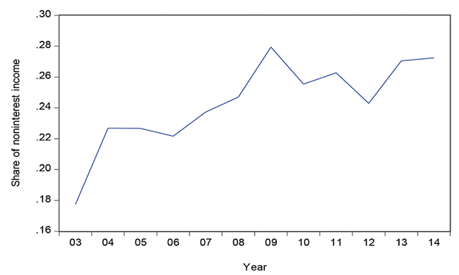 Firstly, a simple glance at Figure 1 shows the relevance of this theme to Brazilian banks. In 2003, noninterest income accounted for only 17.80% of the operating revenue of the banks analyzed. However, by 2014 this share had increased to 27.40%. Thus, income diversification has been a strategy that is present in Brazilian banks as well as in foreign banks, as described by Stiroh (2006) for U.S. banks and by Lepetit et al. (2008a) for European banks.