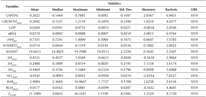 This article uses two variables to measure bank return risk: ROA standard deviation (σROA), which we calculated using a three-year time window; and Z Score , a bankruptcy risk indicator that is used in several studies in the banking literature. The lower the ratio result, the higher the bank’s insolvency risk (Stiroh, 2004, Lepetit et al., 2008a; Stiroh & Rumble, 2006; Sanya & Wolfe, 2011; Mercieca et al., 2007). Due to Z Score relevance in this literature, Lepetit and Strobel (2013) specifically studied this variable and its various measurement forms. The authors found that for samples in panel data, the most appropriate method of measuring this variable is: