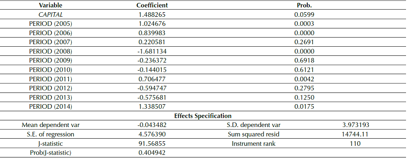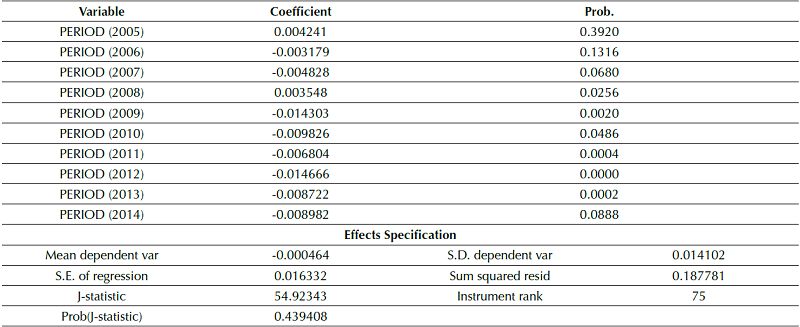 The presence of autocorrelation, heteroscedasticity and endogeneity led the estimation process towards the use of GMM, with a second step, cross sectional data differences and fixed effects for the periods, and Instrumental Variables (IV) estimators as defined by Arellano and Bond (1991). This method is based on the idea that instruments can estimate variables to mitigate endogeneity in models (Lee, Kim, Park & Sanidas, 2012).