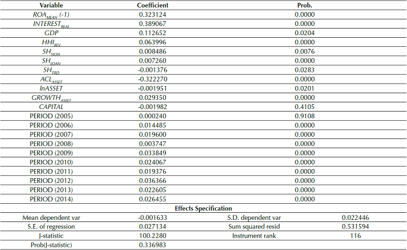 The multivariate econometric model used in this paper considers the risk, return, and risk adjusted return variables as a function of the revenue diversification variables (Stiroh & Rumble, 2006; Chiorazzo et al., 2008; Mercieca et al., 2007). The model uses dynamic panel data GMM (Generalized Method of Moments) to address endogeneity, heteroscedasticity and autocorrelation problems. Estimates were calculated using Eviews 7.2 software, and the econometric model is as follows: