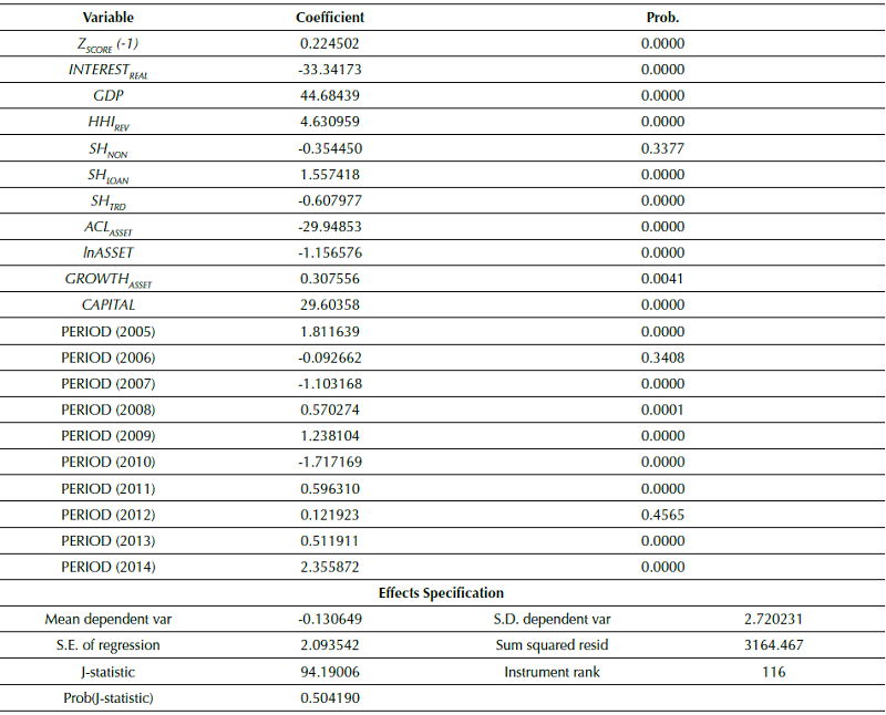 Considering the problems above and the potential presence of endogeneity, mainly because the HHI REV , SH NON , SH LOAN and SH TRD variables, we used an endogeneity test that was first proposed by Hausman (1978) and later improved by Davidson and MacKinnon (1989, 1993). All models had an endogeneity problem at the 1% significance level.