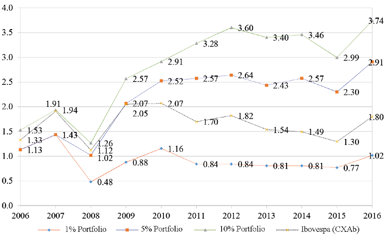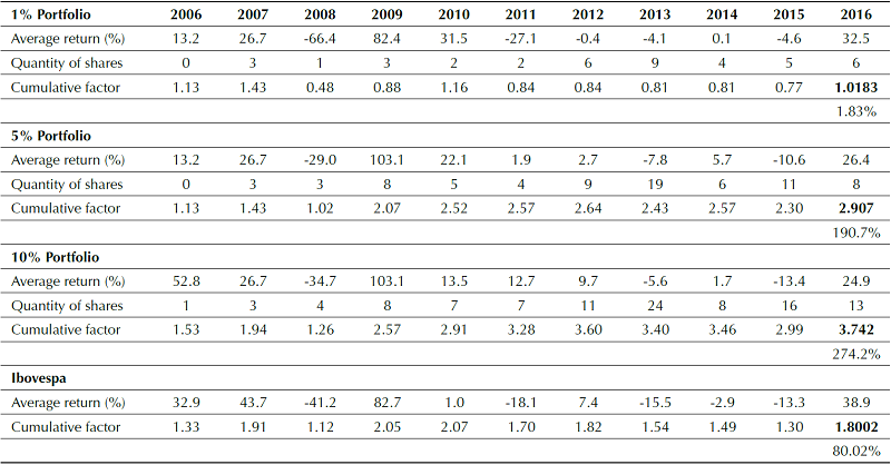 The results presented show that the two portfolios exceeded the Ibovespa in almost every year of the period analyzed. In the case of the 10% portfolio, the cumulative return at the end of the period was almost 274.54%, while the Ibovespa yielded approximately 80.02%. In the case of the 5% portfolio, the total cumulative return in the period was approximately 190%. The results are in line with the results found by Gokhale et al. (2015).
