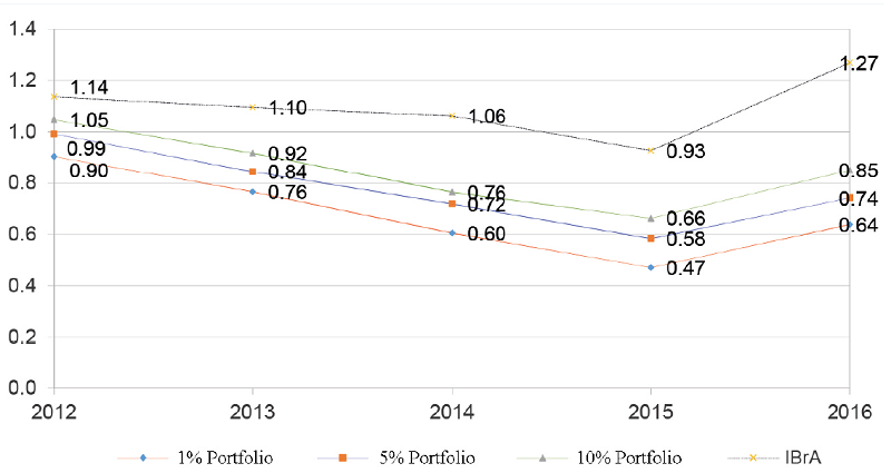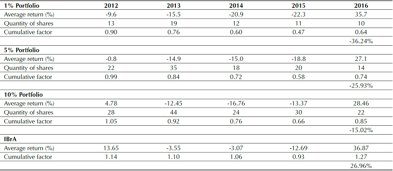 The results presented in Table 2 and in Figure 2 show that the portfolios compiled using the IBrA as a proxy for market returns did not exceed the Ibovespa in any of the years of the period analyzed. In the case of the 10% portfolios, the final cumulative return for the period was negative by approximately -15.02%, which is much below the cumulative return on the IBrA (26.96%). In the case of the 5% portfolios, the total cumulative return in the period was negative by approximately -25.90%.