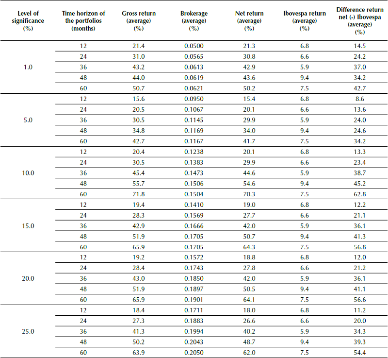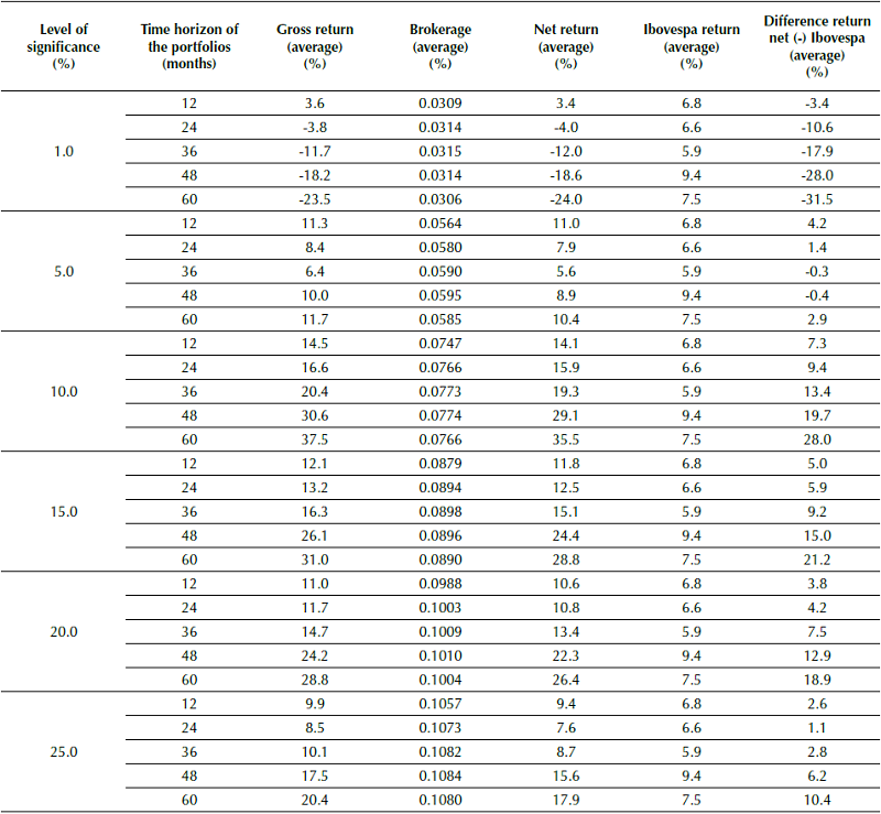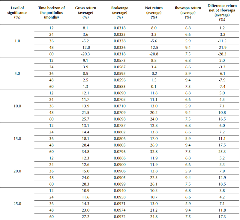 With relation to the level of significance, the results of the simulations reveal that the 10% level is the one that presents the highest average portfolio returns that most exceed the Ibovespa. For example, for the 10% level, the 60-month portfolios obtained an average gain of 28 percentage points more than the Ibovespa. The results for the 1% and 5% levels of significance were generally poorer than for the other levels.
