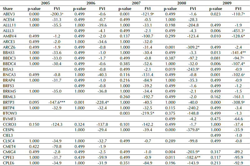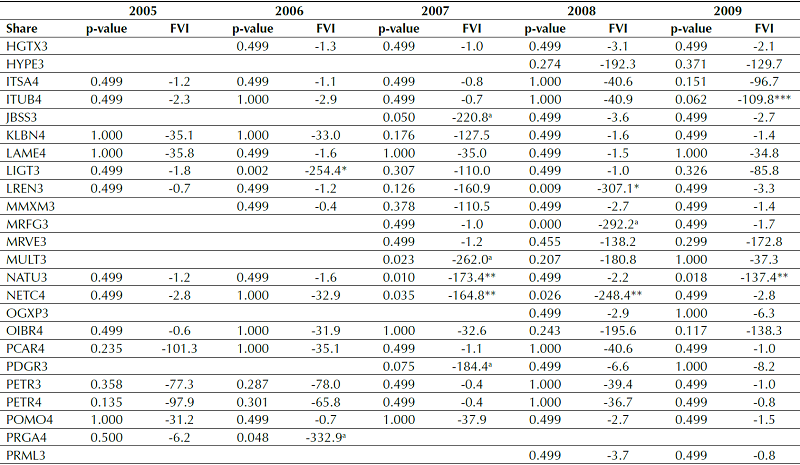 Initially, the test that Gokhale et al. (2015) carried out in the American market was repeated for the Brazilian market. The results of applying the GTT model in the first sample of Ibovespa data indicate evidence of overreaction in every year of the period analyzed, with the exception of 2006, in which no undervalued security was identified, at least at 1%, 5%, and 10% statistical significance. Examples of values calculated annually for each company of the FVI and the p-values of the likelihood ratio tests in the period from 2005 to 2009 can be verified in Annex 1.