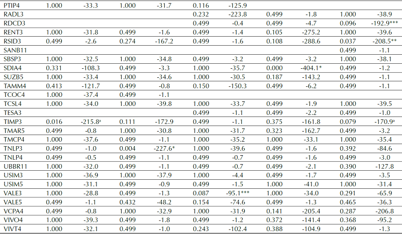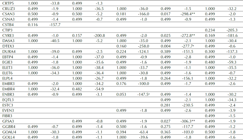 Finally, the GTT model was tested as a short-term investment strategy. The FVI was calculated for a period of 12 weeks and the return was measured in the following three weeks, also in windows. 522 portfolios were simulated for 12 months each, from 2005 to 2016. The average return on the portfolios was negative by 5.84% in relation to the Ibovespa return, at 10% significance and considering transaction costs. The FVI was also calculated for the very short term (four-week calculation period and one week for return) at 10% significance and considering transaction costs; the average return on the portfolios was negative by 18.7%. This evidence confirms the assumptions of Gokhale et al. (2015), who indicated negative performance with the application of the model for short-term investment strategies, given that the model does not identify a share’s change of tendency point, but instead merely communicates whether it is undervalued or overvalued.
