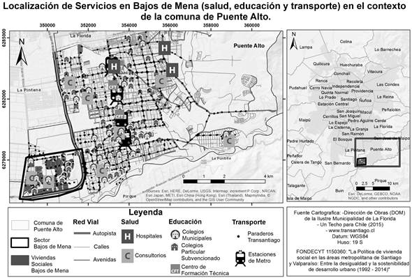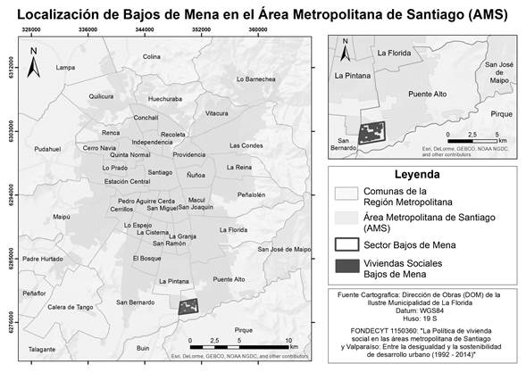 La figura 1 permite apreciar la localización de Bajos de Mena, en el extremo sur-poniente del municipio mencionado y, al mismo tiempo, su separación del territorio comunal, debido a la presencia de vías interurbanas, como es el caso del Acceso Sur a Santiago.