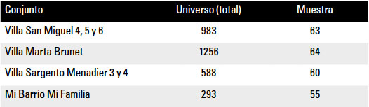 La individualización de las agrupaciones habitacionales involucradas en el estudio, el tamaño de las muestras por cada una de ellas, se expresan en la tabla 1.