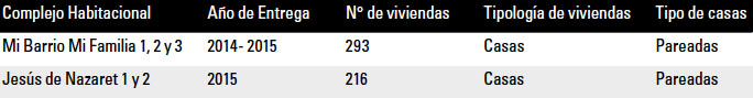 Este avance, donde la cobertura apunta al volumen residencial, acusa como principal problemática una alta densidad habitacional y poblacional. La construcción en bloques de departamentos caracteriza a los conjuntos habitacionales "El Volcán", que en sus tres etapas (1995-1997) promedia una densidad poblacional de 634 hab/ha39; "Francisco Coloane" (1996), con 595 hab/ha; y "Marta Brunet" (1997) con 458 hab/ha, entre otros40. Cabe destacar que estas viviendas no superan los 50 m2 útiles en tamaño, con una tipología de vivienda que tiende a impactar en la comodidad y confort de sus habitantes. Esto se aprecia en los conjuntos residenciales de reciente edificación, correspondiendo a casas pareadas, que pueden ser ampliadas y sobre las que sus propietarios logran generar alternativas para descomprimir el hacinamiento. Un ejemplo de ellos son los complejos habitacionales presentes en la tabla 3.