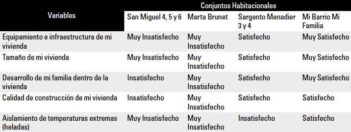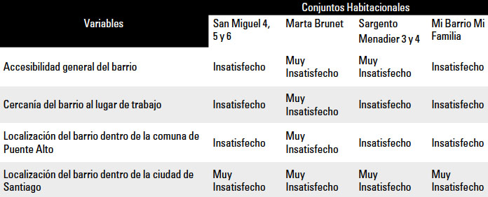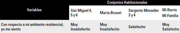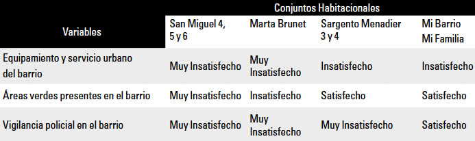 Como se puede observar en la tabla 4, los resultados de la satisfacción residencial concernientes al ámbito calidad de la vivienda, exhiben una relación directa con la política habitacional que instruyó la construcción de los respectivos complejos residenciales. Así, los jefes de hogar que llegaron como nuevos propietarios durante la década de 1990, declaran estar muy insatisfechos con respecto a la mayoría de las interrogantes propuestas en este ámbito; mientras que los residentes que llegaron a partir del año 2000 en adelante, afirman estar satisfechos o muy satisfechos.