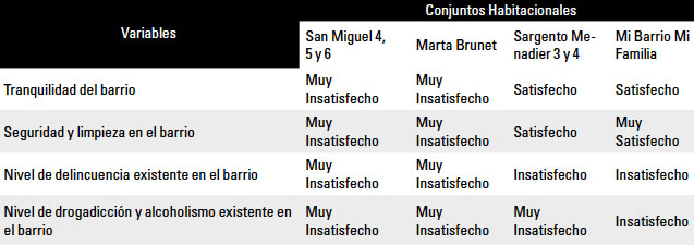 Es así como, en la percepción sobre delincuencia, consumo de drogas y alcoholismo, se manifiestan afirmaciones insatisfactorias o muy insatisfactorias en los cuatro conjuntos de viviendas sociales que comprenden esta muestra. Esto podría relacionarse con las problemáticas ya descritas en equipamiento y accesibilidad al sector de Bajo de Mena. De todas formas, la mayor satisfacción se concentra en las nuevas construcciones, destacando los complejos de Sargento Menadier y Mi Barrio Mi Familia, altas valoraciones respecto de la satisfacción residencial. Aunque debe ser verificado con mayor información, es posible inferir que la presencia de redes de apoyo y programas de intervención focalizada, como los indicados en la tabla 2; además de otras iniciativas desde el municipio o el gobierno central, tengan un mayor impacto perceptual sobre aquellos residentes de reciente ingreso al sector, en contraposición a las situaciones que han experimentado quienes llegaron a principios de la década de 1990.