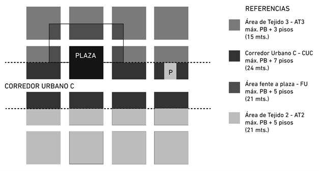 Supóngase una parcela “P” frentista al corredor “C”, ubicada a 150m de una plaza en la misma vereda. Como el área del tejido circundante a dicha parcela (color amarillo) permite 15 m de altura, si el propietario de la parcela P aspirara a edificar hasta los 24 m permitidos por la nueva ordenanza para Corredores urbanos (color rojo), debería pagar la diferencia hasta llegar a los 24 m. O sea 9 m que, en este caso, equivalen a 4 pisos de su proyecto.
