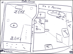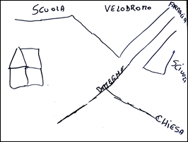 Al contrario, los entrevistados que tienen un nivel escolar bajo -ya sean adultos o jóvenes- mostraron serias dificultades para representar su propio barrio. Frente a la solicitud de dibujar, casi todos esbozaron ‘el camino a casa’ (figura 2) y, mientras explicaban su dibujo, justificaban la escasa información a través de un desconocimiento del barrio, del hecho de no salir nunca de casa, de conocer solo a los parientes y a los vecinos de su propio edificio.