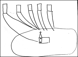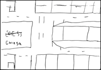 Así, la importancia de la estructura eclesiástica como punto de referencia es clara. La iglesia es parte de la vida cotidiana y, en consecuencia, está al centro de relatos y trazados. Por otro lado, como mencionamos, puede llegar a constituir un elemento de unificación del espacio para ciertos habitantes. Eso es evidente en representaciones como el mapa perceptivo de la figura 7, en el cual pareciera que todas las calles llevan a la iglesia.