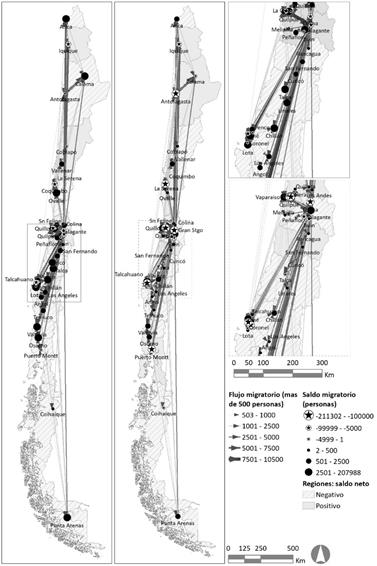 En los mapas de la Figura 2 se representa el origen, destino y magnitud de los flujos migratorios, así como el signo y volumen de los saldos migratorios para los períodos estudiados. En ambos mapas se observa, por una parte, la concentración en Santiago de los flujos entrantes y salientes más voluminosos y, por otra, la mayor densidad de conexiones bilaterales en las regiones centrales del país, acorde con la estructura más compleja de la red urbana de estas regiones.