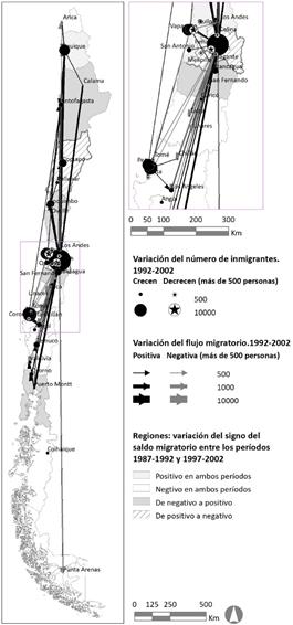Los inmigrantes han aumentado considerablemente, durante este período, en el Gran Santiago, Concepción, Talcahuano, Valparaíso e Iquique; al contrario, han descendido de forma muy acusada en Quilpué, Peñaflor, Buin y La Calera. Por otro lado, el número de emigrantes ha crecido notablemente en Antofagasta, Villa Alemana, Puerto Montt y La Serena.
