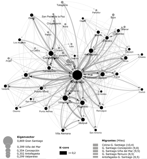 El núcleo de la red (k-core: 0,177) está constituido por las principales ciudades y, en conjunto, es un componente gigante, bastante permanente en ambos quinquenios, que da gran estabilidad estructural a la red; el resto de las partes tienen un tamaño bastante menor que este núcleo. Algunas ciudades actúan como hub del sistema, pues sus emigrantes se dirigen a ciudades a las que también llegan emigrantes de otras varias ciudades (en 2002, están una desviación típica por encima de la media: Santiago, Viña del Mar, Antofagasta, Iquique, Colina, Valparaíso). Otras terceras, son emisoras o receptoras netas de migrantes (Tabla 5).