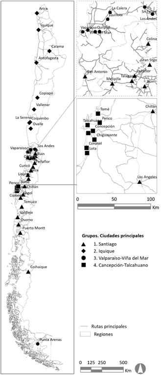 Estos agrupamientos muestran diferencias destacables en su organización espacial y en sus propiedades funcionales. El grupo más grande, el 1, está compuesto por 20 ciudades que se localizan en una franja que se extiende por el centro y sur del país, desde Colina hasta Coihaique. Las ciudades del grupo 2 también adoptan una disposición longitudinal, desde Arica, al norte, hasta Ovalle, en el centro. En ambos casos, la ruta 5 constituye el principal eje vertebrador de los sistemas urbanos. El grupo 4, posee una de las configuraciones más compactas, al igual que la mayor parte de las ciudades del grupo 3. La ciudad de Punta Arenas se incluye en este último grupo (Valparaíso-Viña del Mar), aunque sus flujos migratorios bilaterales más grandes los tiene con Santiago. Sin embargo, la suma de las relaciones migratorias con las ciudades de este grupo 3 -que, a su vez, están muy interconectadas- son mayores que las que mantiene con cualquier otro grupo. De ahí su inclusión en este clúster, lo que incrementa considerablemente el recorrido medio de los migrantes de este grupo y reduce su compacidad espacial.