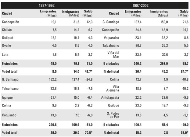 En primer lugar, hay que destacar las diferentes proporciones de inmigrantes y emigrantes que concentran las ciudades con mayores y menores saldos migratorios en 1987-1992 y 1997-2002. Si, en el primer período, las ciudades con los cinco saldos migratorios mayores suponían menos de la mitad del total de los saldos positivos (42,7%), este mismo indicador ascendía al 84,7% en el segundo quinquenio, es decir, refleja la fuerte concentración de los inmigrantes, principalmente en el Gran Santiago y, en menor medida, en las otras ciudades más grandes. En cambio, como ya se ha indicado, los saldos negativos están menos concentrados en 2002 que en 1992.