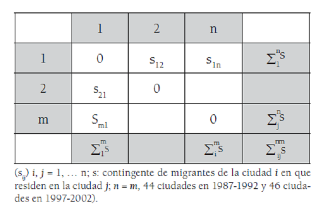 / población total de la ciudad en un año determinado). La comparación de los totales de fila con los totales de columna correspondientes a la misma ciudad, proporciona el balance de dicha ciudad de la inmigración y emigración interurbana (Tabla 1).