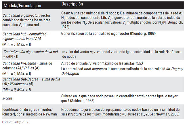 En general, las medidas están construidas a partir de diferentes tipos de relaciones que se pueden establecer entre los nodos o grupos de nodos y aristas y los valores de sus atributos. De las medidas disponibles para describir las redes, que rebasan el centenar, se han seleccionado aquellas que, a priori, son más congruentes con la naturaleza del fenómeno aquí tratado, es decir, con una red bilateral, direccionada y con información espacial, en la que es posible la relación directa de un nodo con cualquier otro de la red, sin utilizar otros intermedios.