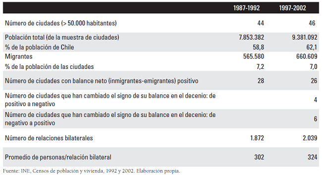 Entre 1992 y 2002 el peso demográfico de las ciudades mayores de 50.000 habitantes se incrementó, en grado considerable, respecto de la población total de Chile debido a las aportaciones de los flujos migratorios procedentes de asentamientos de menor tamaño con destino a aquellas ciudades.