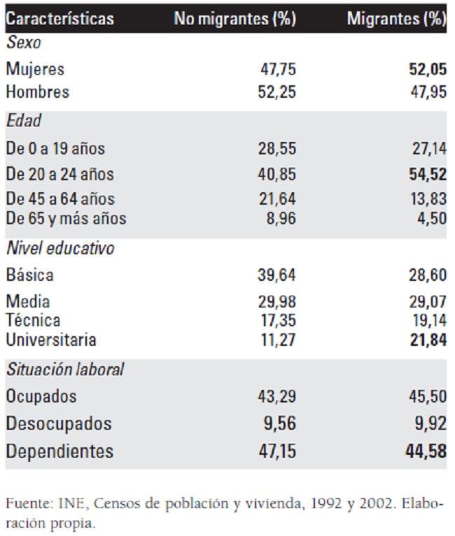 Por otra parte, los datos agregados de las características de los migrantes muestran que, en general, predominan los jóvenes, hombres y mujeres, con formación elevada: muy probablemente, el grueso de la corriente migratoria tiene un carácter laboral y está formada por individuos más que por familias.
