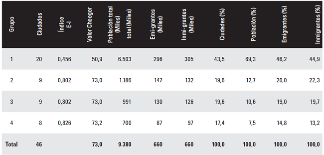 Los clústeres identificados también contrastan por su grado de cohesión interna. El grupo 1 se caracteriza por la considerable intensidad de sus conexiones migratorias recíprocas, frente a los otros tres, cuyo grado de apertura es considerablemente mayor, como indican sus respectivos valores Cheeguer e índices E - I. El examen de los flujos migratorios revela que los agrupamientos se forman, sobre todo, por la fuerza polarizadora ejercida por las grandes entidades urbanas funcionales, especialmente Santiago (grupo 1) (Schiappacasse, Contreras y Fuensalida, 2001) y, en menor medida, Valparaíso-Viña del Mar y Concepción-Talcahuano (grupos 3 y 4 respectivamente).