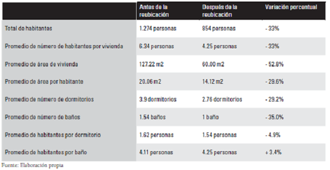 A pesar de las menores dotaciones de m2/hab, el promedio de habitantes por dormitorio bajó de 1.62 a 1.54 habitantes. Ello podría deberse a que las antiguas viviendas tenían dormitorios más grandes y más áreas comunes, lo cual es fundamental considerando la gran cantidad de familias extendidas que las habitaban. En la zona de afectación vivían 1.38 hogares por cada vivienda y al menos 24% de la población residente no era parte de las familias nucleares principales (Walsh Peru S.A., 2011; Instituto Nacional de Estadística e Informática [INEI], 2007).