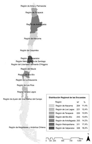 La metodología utilizada en este estudio comprende dos partes, a saber, la utilización de herramientas cuantitativas (encuesta de nivel nacional) y cualitativas (entrevistas enfocadas en una región). Para la parte cuantitativa se utilizan los resultados de una encuesta realizada a hogares que viven en campamentos de aquellas regiones del país donde ha aumentado la cifra de campamentos entre los años 2011 y 2016, en un total de 60 campamentos ubicados en siete regiones de Chile: Tarapacá, Antofagasta, Atacama, Valparaíso, Metropolitana, Biobío y Los Lagos (Figura 1). La encuesta fue realizada a 1.785 hogares, alcanzando un porcentaje de cobertura que permite lograr un margen de error del 5% para muestras regionales. El cuestionario estructurado, que tuvo un total de 45 preguntas, fue confeccionado por profesionales de CIS TECHO-Chile y piloteado y ajustado por los autores de este artículo, previo a su aplicación definitiva en los campamentos. El cuestionario fue aplicado a jefes de hogar o cónyuges que fueron anteriormente avisados del día y hora de la encuesta por los dirigentes vecinales en contacto con CIS TECHO-Chile, institución que además facilitó encuestadores voluntarios previamente capacitados.