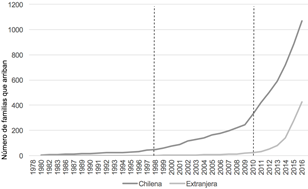 Es posible evidenciar dos periodos característicos de llegada a los campamentos encuestados en los últimos 20 años (Figura 2): el primero, entre 1998 a 2010, donde llegaron a campamentos el 14% de las familias encuestadas, a razón de 20 familias por año, subiendo el promedio anterior del periodo 1978-1997, que era de tres familias por año. El segundo periodo característico va desde 2010 al presente (2016), donde arribaron a los campamentos estudiados 1.531 familias (169 familias por año). Del total de familias que arribaron a campamentos en este periodo, el 33,68% tiene nacionalidad distinta a la chilena, con una tasa de arribo a razón de 57 familias al año. Además, destaca el año 2013 como el punto de inflexión de la curva de crecimiento de familias migrantes en proceso de campamentación.