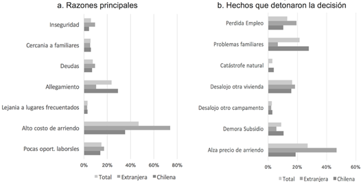 Respecto de los “hechos que detonaron la decisión de mudarse a un campamento” (Figura 3b) el más recurrente tiene relación con el alza en el costo del arriendo (a nivel general, 27,04%), donde nuevamente los grupos más afectados son los hogares extranjeros (46,88%) y colombianos (62,90%). Los siguen factores detonantes como problemas familiares (21,43%), pérdida del trabajo (13,01%), y desalojo de la vivienda previa (16,45%).