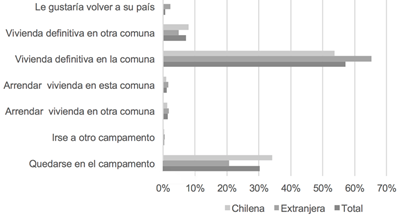 Finalmente, en un contexto donde menos de un 3% de los migrantes encuestados desea retornar a su país de origen, es interesante conocer las expectativas habitacionales de los diferentes grupos (Figura 4). A un 65,27% de los encuestados les gustaría tener una vivienda definitiva en la misma comuna, siendo apenas un 5,02% quienes preferirían una vivienda definitiva en otra comuna. Entre las familias chilenas, esta última opción es algo más alta (8.07%), aunque no tanto como la preferencia por quedarse en el campamento, que expresan un 34,26% de las familias nacionales. En paralelo destaca la bajísima preferencia por adoptar la condición de arrendatario, o volver a tenerla, ya sea en la misma comuna o en otra, lo que evidentemente tienen relación con el “anhelo” de la vivienda en propiedad, correspondiente con una aspiración de estabilidad financiera, y también con el temor de vivir nuevamente situaciones de vulnerabilidad, enfrentados a un mercado del arriendo altamente desregulado, y marginalizados de un mercado inmobiliario económicamente excluyente.