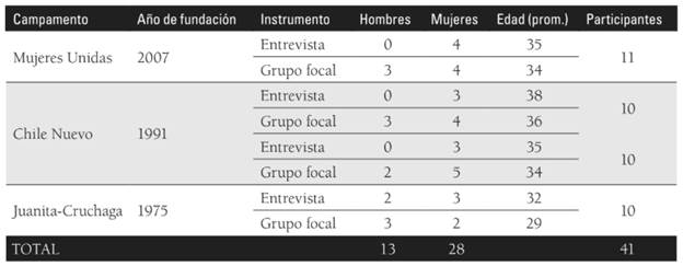 Para la parte cualitativa se utilizan los resultados de un estudio encomendado por el Ministerio de Desarrollo Social (MIDESOC) a TECHO-Chile, con el fin de conocer la trayectoria de migrantes que llegan a vivir en campamentos de la Región de Antofagasta. Se aplicó un total de 41 entrevistas -semiestructuradas y grupos focales-, en tres campamentos con presencia de familias migrantes (Tabla 1). Dentro de cada campamento se escogieron a los entrevistados por medio de la metodología “bola de nieve”, aunque los dirigentes también recomendaron quiénes serían idóneos tanto para entrevistas como para grupos focales. Debido a los objetivos de la investigación, solo se trabajó con entrevistados extranjeros, realizando un muestreo teórico (muestra no probabilística) con saturación de la información.