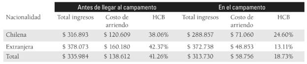 El porcentaje de los ingresos destinados al gasto familiar en vivienda (housing cost burden, en inglés), en el caso de estos hogares, específicamente gasto en arriendo, también marca una diferencia importante entre el antes y después de acceder al campamento. En promedio, los hogares que antes de acceder al campamento destinaban casi un 40% de sus ingresos al arriendo (en Chile, el máximo nivel de endeudamiento exigido por la banca para una hipoteca de vivienda es de un 25% del ingreso familiar), disminuyeron ese porcentaje a un 18,73% una vez llegados al campamento (Tabla 2). Esta drástica reducción de costos asociados a la vivienda ocurre incluso en el contexto de una disminución de los ingresos promedio de los hogares, de $335.984 (US$ 517, antes del campamento) a $313.730 (US$ 483, después de llegar al campamento). Esta última reducción se explica probablemente por un acceso menos diversificado a empleos.