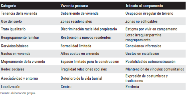 Se produce para el migrante, entonces, un transitar entre una situación de precariedad a una situación de exclusión, donde aspectos como subarriendo es reemplazado por ocupación irregular del suelo, la discriminación racial es reemplazada por el estigma territorial, y los altos costos de vivienda son reemplazados por la posibilidad de la autoconstrucción, pero en una situación de riesgo socionatural (Tabla 3). Los datos confirman la tesis de Morales et al. (2017) relativa a que, con la campamentación, el sujeto permanece funcionalmente en la ciudad, en sus márgenes físicos, pero sin pertenecer plenamente a la sociedad.