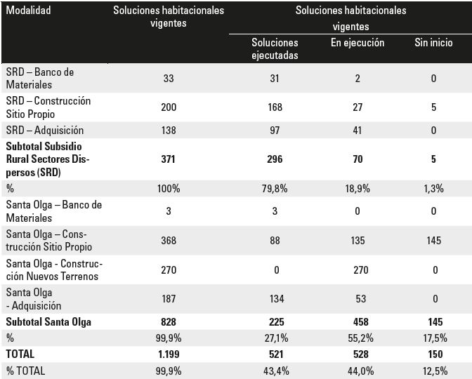 Cabe destacar que -a nivel operativo- se utilizaron dos grandes categorías para la intervención estatal: lo que se denominó como “reconstrucción urbana”4 (Santa Olga, Altos de Morán y Los Aromos), que considera obras y equipamiento urbano y lo que denominó “reconstrucción de la ruralidad dispersa” (el resto de los casos, repartidos en diferentes localidades rurales de la Región). Como se puede apreciar en la Tabla 1, respecto del avance en la entrega de subsidios, construcción y/o compra de viviendas, el MINVU informa que, al 31 de marzo del 2019, existen 1.199 soluciones habitacionales vigentes (que corresponde al 99,9% del universo de subsidios por entregar), con diversos estados de avance.