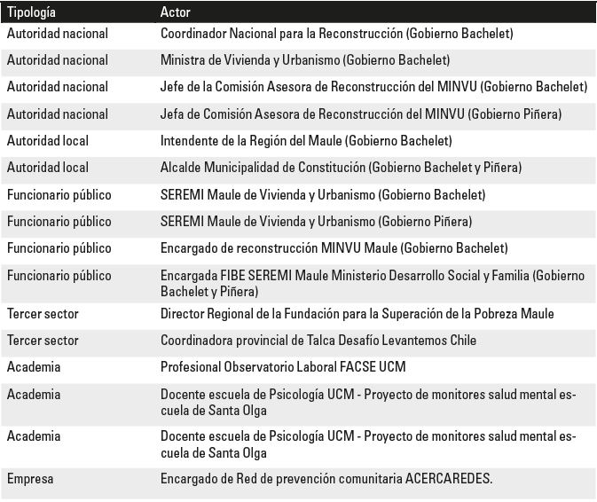 Como se puede apreciar en la Tabla 2, con el objetivo de trabajar los objetivos fijados para la investigación, se realizaron entrevistas semiestructuradas a las 10 principales autoridades (nacionales y locales) y funcionarios públicos vinculados a la reconstrucción (tanto del segundo mandato de la Presidenta Michelle Bachelet, como del segundo mandato del Presidente Sebastián Piñera, que inició el 11 de marzo de 2018). A la vez, se entrevistaron a otros 6 actores relevantes del tercer sector, empresa y academia local.