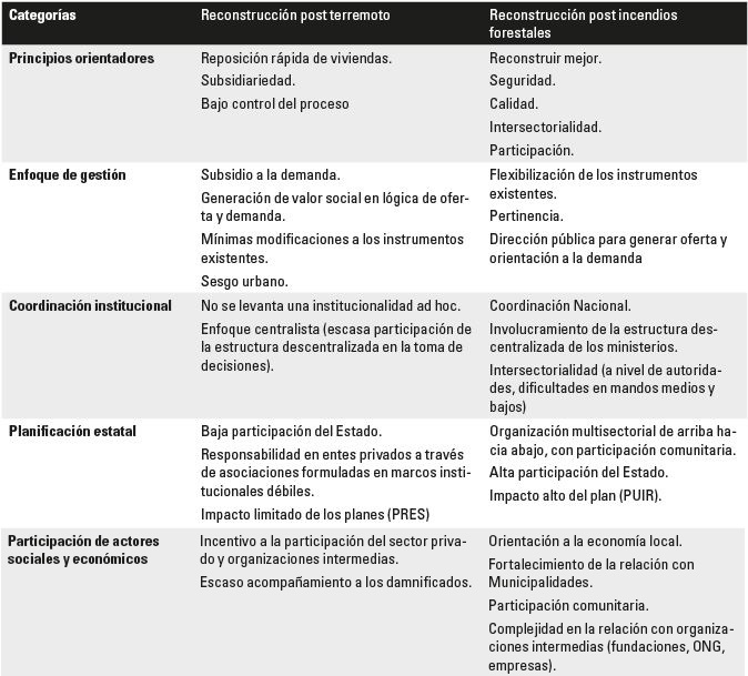 Como pudimos apreciar a través de la literatura analizada y de los resultados expuestos, el Estado en Chile ha organizado las reconstrucciones de sectores rurales luego del terremoto 2010 y de los incendios 2017 bajo distintos énfasis, en términos técnico-políticos. Queremos destacar que no es objetivo de este trabajo comparar dos catástrofes -que no son comparables en término de magnitud, extensión territorial y tipo de daño- sino profundizar en las lógicas estatales de intervención.