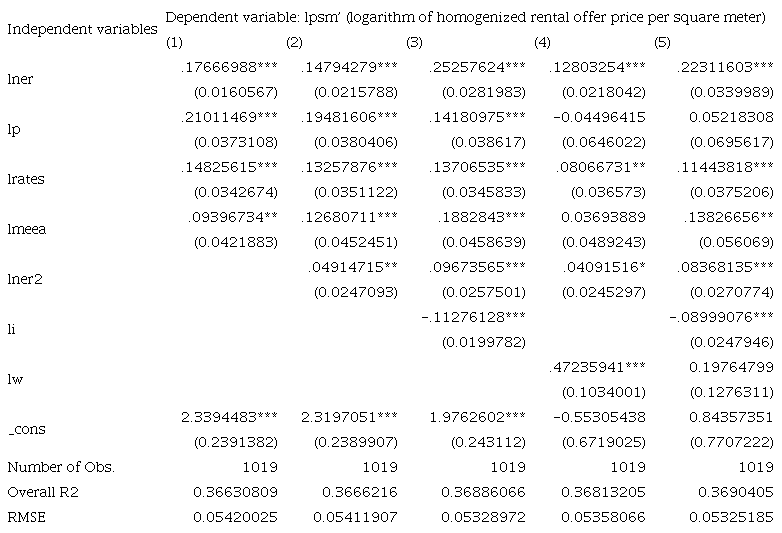 The control variables included in the specification (1) reveal the relevance in terms of magnitude and statistical significance that holds the general inflationary dynamics on rental prices in the city of Buenos Aires. In particular, a 10% increase in the price index -p- increases the rental prices per square meter by 2.1%, ceteris paribus. In addition, it seems that there is also a positive relationship with activity levels, given that the monthly activity coefficient is significant and positive.