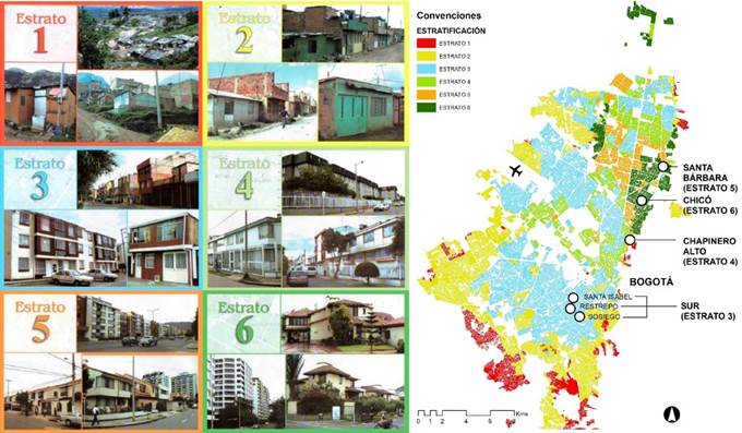 Borrero Ochoa (2010) propone que este estatus social se vea reflejado en el sistema local de distribución de subsidios para el pago de tarifas de servicios públicos llamado “estratificación socio-económica.” Este sistema asigna a cada vivienda de la ciudad un “estrato” de acuerdo a las características del urbanismo y la vivienda según la manzana en la cual esté ubicada, como lo indica la Figura 1. El estrato sube de 1 a 6, siendo categorizadas en estrato 1 y estrato 2, manzanas desarrolladas con un urbanismo informal -el 7 y 33% de las viviendas de la ciudad respectivamente-; el estrato 3, son las áreas antiguas de ciudad y los complejos multifamiliares de bajo costo -el 36% de las viviendas-; y el estrato 4, 5 y 6, son las áreas desarrolladas formalmente subiendo de acuerdo a la calidad percibida de su urbanismo y vivienda -respectivamente el 15, 5 y 4% de las viviendas (Secretaría Distrital de Planeación [SDP], 2016). Los estratos permiten aplicar subsidios cruzados al pago de servicios públicos como el agua y la electricidad. Como ejemplo: para el agua, las viviendas clasificadas en estrato 1, 2 y 3 pagan un valor subsidiado para el consumo básico de hasta 19 m3 al mes. El estrato 4 paga el valor de costo del servicio y los estratos 5 y 6 pagan un aporte adicional al costo del servicio (Acuerdo 659, 2016). Si bien, el indicador de estrato no incluye como variable el ingreso familiar, este indicador ha sido ampliamente asimilado por la sociedad como un indicador de estatus social y se le responsabiliza de agravar la segregación socio-espacial (Uribe-Mallarino, 2008). Según Borrero Ochoa (2010, p. 18) el crecimiento urbano en Bogotá se orienta desde los estratos altos (5 y 6) que buscan alejarse de las áreas desarrolladas informalmente (estratos 1 y 2).