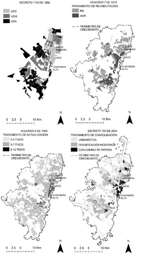 La ciudad de Bogotá en el período analizado tuvo cuatro esquemas de norma urbana de usos de suelo y densidades y/o alturas máximas que afectaron los sectores del estudio, que se muestran en la Figura 2. Estos cambios de estatutos se convirtieron en norma oficial a través de “decretos” o “acuerdos” siendo los decretos órdenes ejecutivas tomadas por el alcalde individualmente y las disposiciones establecidas en consenso con el Concejo de la ciudad.