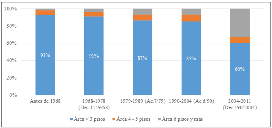 El desarrollo efectivo de la densificación de la ciudad, promovida por la norma entre 1968-2011, se puede observar con los datos del catastro. La Figura 3 muestra la altura de las edificaciones registradas en 2012 según su fecha de construcción agrupada en períodos normativos. Estos porcentajes deben ser interpretados como una estimación del área desarrollada en cada período. La composición por alturas es similar a la obtenida por otros trabajos que analizan información de licencias de construcción (Jaramillo, Parias y Llano, 1993). En la Figura 3 se puede observar que a pesar de que el PCU fue implementado en 1979, sólo fue hasta el período más reciente, después de 2004, que la ciudad tuvo un proceso de densificación significativo. Las cifras muestran que la implementación del PCU, entre 1979 y 2004, coincide con un aumento moderado de la construcción en altura, que pasa a representar el 15% de la nueva área construida -en un período que fue también el de mayor crecimiento demográfico de la ciudad. Sin embargo, es a partir del Decreto 190, en 2004, cuando la ciudad se densifica de manera considerable. El 40% de las nuevas edificaciones de la ciudad tuvieron una altura mayor a cuatro pisos en 2011, y aproximadamente un 33% tuvo una altura mayor a seis pisos. Esto puede estar relacionado a que en este último período se rellenaron casi totalmente los predios aún vacíos dentro del PCU, y a unas normas generosas en límites de altura.
