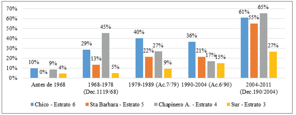 La Figura 6 compara los límites de altura de los casos de estudio en los planes de zonificación. Como lo indica la tabla, los cambios de altura han sido diferenciados para cada una de las zonas. El aumento de límites de altura ha sido mucho mayor en Chicó, el segmento con mayor precio de vivienda. Los límites de altura han sido estables en Santa Bárbara-estrato 5-y han disminuido en los segmentos de menores precios Chapinero Alto-estrato 4-y Sur-estrato 3. Esto demuestra que hubo una aplicación diferenciada de las estrategias de densificación que respondieron al PCU en los últimos 30 años, privilegiando al segmento más alto de precio de la vivienda.