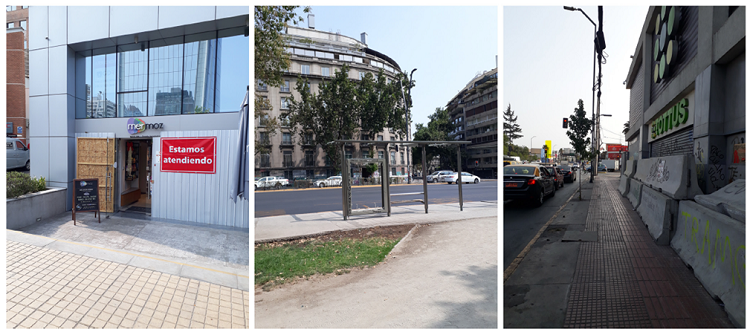 Entre octubre y enero, las rutas cotidianas de las caminantes del estudio se desarrollaron en un contexto de incertidumbre, que cambiaba diariamente a merced de cómo se desarrollaba el estallido social. En la mayoría de los casos, los paisajes urbanos por los que ellas transitaban se transformaron de manera temporal o permanente (figura 2). Rejas peatonales y paraderos rotos y quemados, calles cortadas por barricadas o carabineros, sectores con olor a lacrimógena, protecciones de zinc en algunos comercios, supermercados saqueados que permanecieron cerrados, carteles que tomaban posición política (“Somos PYME, apoyamos la causa”), semáforos sin funcionar, rayados y carteles en edificaciones, estaciones de metro cerradas, y la reconfiguración de prácticas de comercio ambulante componen una nueva y desafiante escenografía para los desplazamientos de estas caminantes.