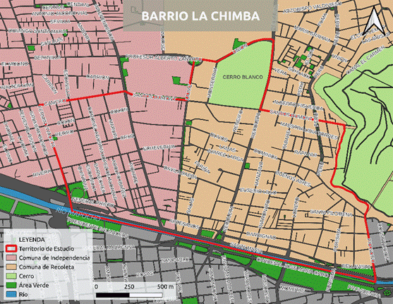 Esta investigación se localizará en La Chimba. Barrio ubicado en el sector norte de la Región Metropolitana, entre las comunas de Recoleta y la comuna de Independencia, ambas ubicadas en la ribera norte del río Mapocho. Ambas comunas son mixtas. Además de que coexisten diversidad de usos, cohabitan diversidad de residentes (Ahumada, 2016).