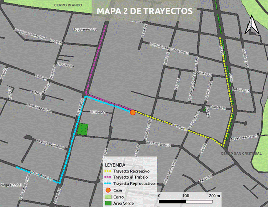 Al analizar los resultados se pudo observar que todas las mujeres realizaban a lo menos una trayectoria referente a la movilidad del cuidado. Las mujeres con trabajo remunerado marcan el recorrido desde su hogar al trabajo e incorporan, además - a lo menos- una ruta de trabajo reproductivo. Las mujeres sin trabajo remunerado trazan uno o más recorridos relacionados a tareas reproductivas. Ir a La Vega es el recorrido más usual, luego aparecen actividades como ir a la feria, al consultorio, a la escuela, entre otras. No es extraño encontrarse con estas trayectorias, debido a que todas las participantes tienen al menos un hijo y deben realizar tareas reproductivas asociadas a ellas/os/es, siendo solo una participante quien señaló que su marido es quien va a La Vega. Una pregunta ausente en esta investigación es si las participantes son cuidadoras de adultas/os/es mayores o con otras necesidades de cuidado, lo que por supuesto también incide en la movilidad cotidiana de las personas.