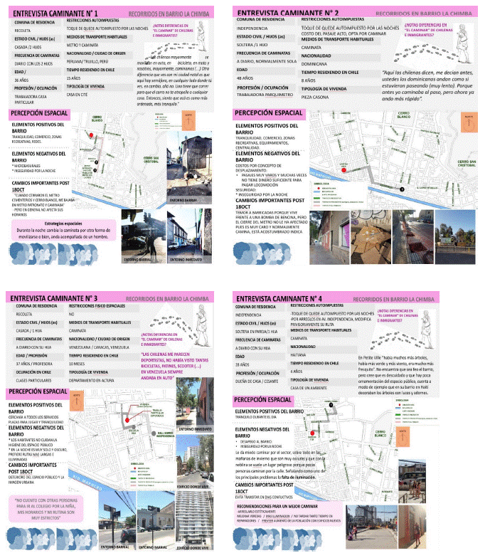 The research explores urban walking practices in the La Chimba neighborhood, Santiago of Chile, using a qualitative perspective trough focus groups and directed interviews combined with shadowing techniques of women from the global south.