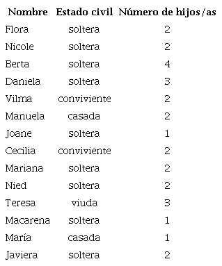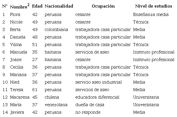 La muestra está compuesta por un total de catorce mujeres migrantes (Tabla 1). Se incluyó también a una mujer chilena, pues se consideró que su opinión podía servir para contrastar las experiencias. En total, la muestra está compuesta por nueve mujeres peruanas, dos haitianas, una venezolana, una colombiana y una chilena. Fueron también convocadas mujeres dominicanas, pero no llegaron a los grupos focales.