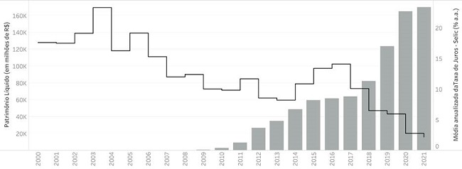 Devido à queda, a relação inicialmente apontada por Sanfelici e Halbert (2018) se inverte. Com os juros menores, os títulos públicos tendem a perder atratividade fazendo o capital migrar para investimentos com retornos (e riscos) maiores. No Figura 1, é possível observar que a redução da taxa de juros desempenha um importante papel ao favorecer a ampliação do patrimônio líquido dos FIIs, especialmente pela migração de recursos advindos de investidores do tipo pessoa física. No decorrer da crise político-econômica desencadeada em meados de 2013 - momento em que a taxa de juros voltou a subir -, a indústria de fundos imobiliários praticamente se estabilizou, apresentando um crescimento bastante tímido. No entanto, o porvindouro contorno da crise a partir do estabelecimento de um novo governo com um viés econômico liberal trouxe os juros a níveis mínimos históricos (chegando a 2% em agosto de 2020), fato que desencadeou uma nova retomada, mais intensa inclusive, de desenvolvimento dos FIIs.